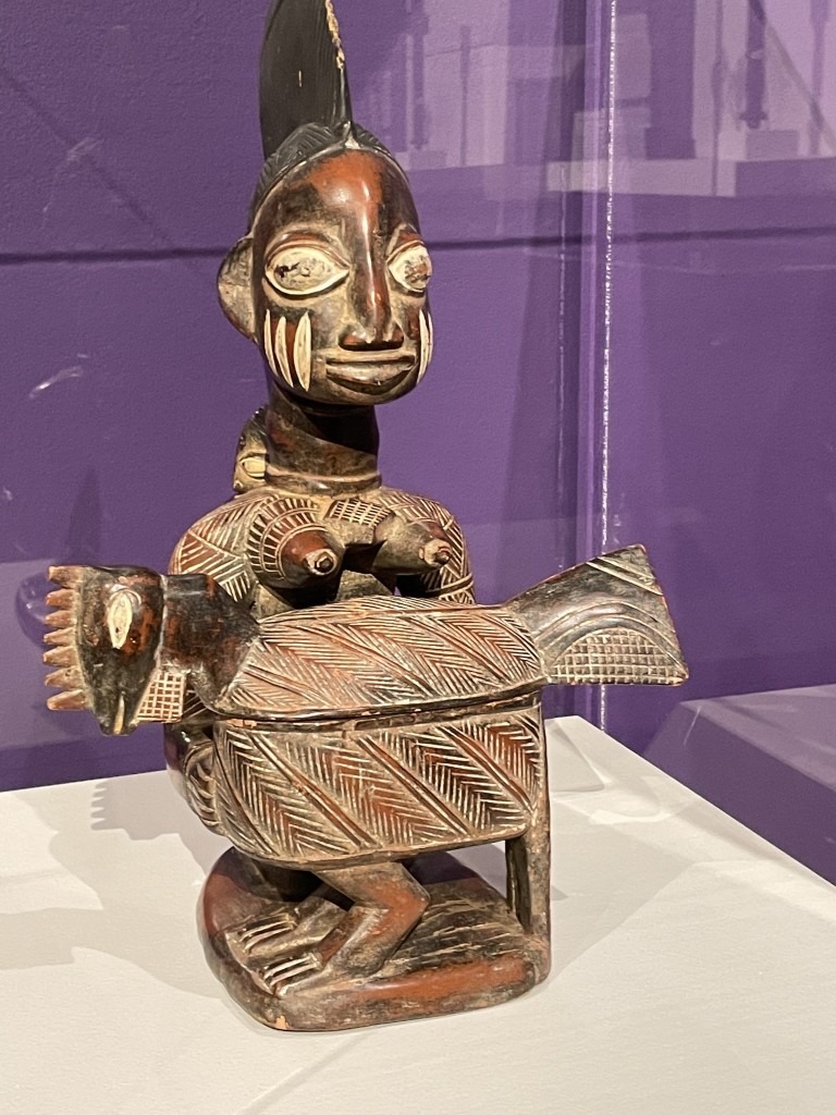 Hidden symbolism is seen throughout Yorúbà art works. From the exhibition’s brochure, a description of the divination vessel –