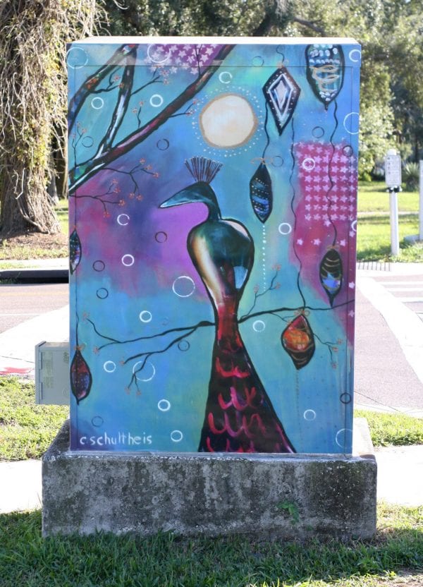 Clearwater Arts Alliance Public Art Installation The public art at the parking garage at 640 Pierce St. in downtown Clearwater features the work of one of CAA’s selected signal box artists, Candy Schultheis. An award-winning artist based in Dunedin, Schultheis has shown her work throughout Rhode Island and Florida, including many solo shows and she teaches at the Dunedin Fine Arts Center. Her work is currently on exhibit at DFAC, Celestial Circle in Palm Harbor, and in her studio, CanLo Studio. For more information about the “Thinking Outside the Box” project, or to sponsor a new art installation on a signal box, please contact the Clearwater Arts Alliance at info@clearwaterartsalliance.com or call us at 727-245-0077.