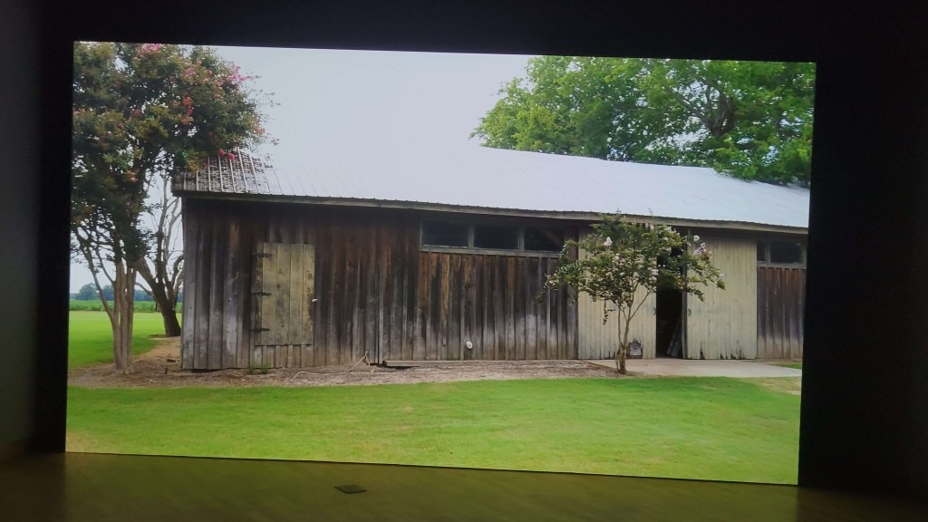 Four Stations at the end of this dark hallway is on a very large, borderless screen. This is a recording of Gatson’s trip to Money, Mississippi, where a 14-year-old Black boy named Emmett Till was murdered after being accused of harassing a white woman in 1955. Gatson honors Emmett and his mother with cosmic effects, psychedelic jazz, trumpets and harps, to signify their place in the heavens.