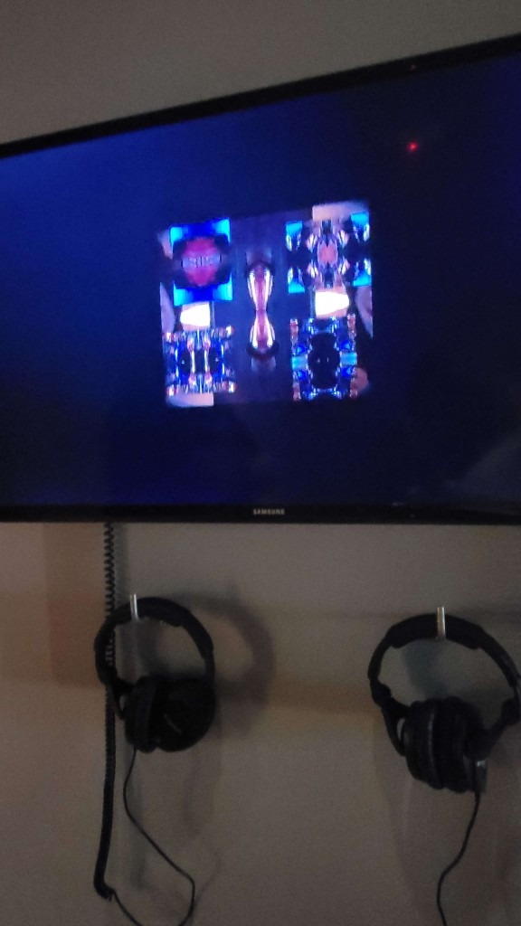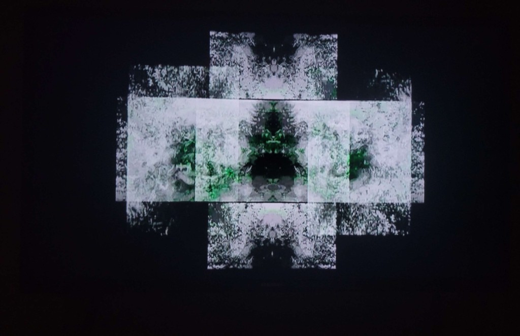 A dark hallway with screens and headphones contrasts with the bright and bold room I was in – three screens, each with two pairs of headphones for listeners. These digital works featured Kaleidoscopic motion-pictures and recordings.