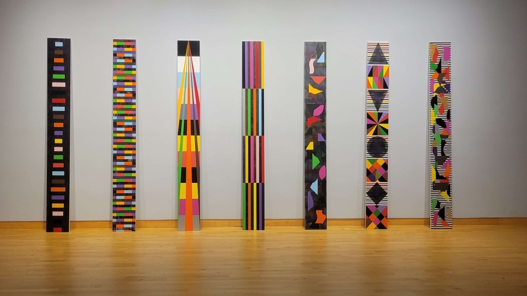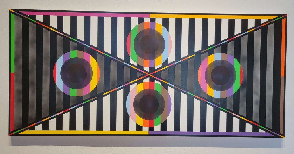 The black and white stripes surrounded by colors at the corner of my left eye caught my attention. The colors of the prism are carried by the eyes of the painting – the circles – against black and white pillars, the two triangles touching from side to side bringing a negative color effect to those streaks while darkening the white and bringing luminosity into the black.