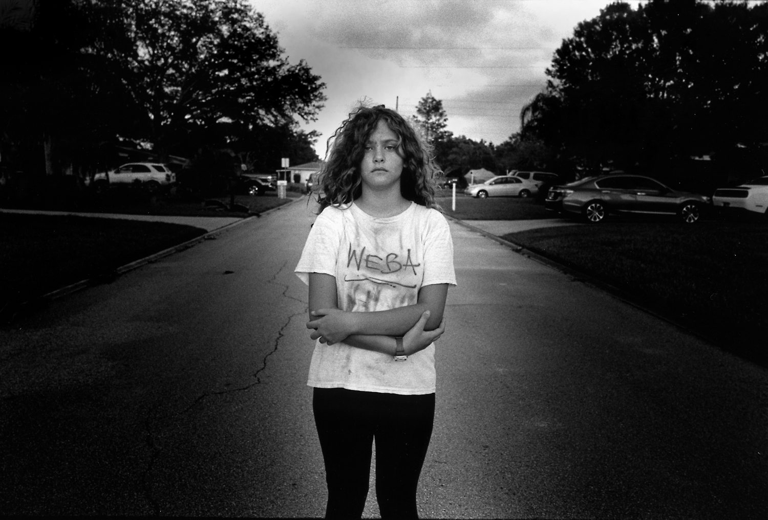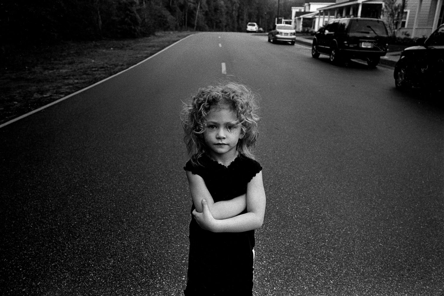 Two photos, a decade apart. The older image, obviously, better: overcast light after a light rain on a street in South Carolina. The recent one, backlit by a sun sinking beneath the horizon, the clothing not suited for a panchromatic image. But what is interesting are the arms in each photo. When my granddaughter was four, and I saw her black dress and the light bouncing off the wet surfaces, I asked her to stand in the middle of the road. She just put her arms the way she did and that’s what I got. In the recent photo, I was not even thinking of the first photo. It was in front of our house in Clearwater. Same wide lens. And without coaching, there were the arms again, folded in a similar fashion. I didn’t realize this until I saw it in the darkroom. I had forgotten about the latter image. That is the mystery of film. It records what the mind doesn’t remember or even see. You don’t get a chance to check the back of the camera as in digital photography. So it’s easy to not know what you have, especially if weeks pass before you develop the film. I think a contemplative portrait of a child can capture a future personality trait. But I guess you have to observe the child while shooting.