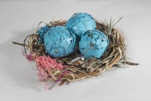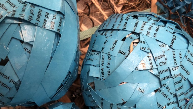 The “eggs” or treasures are three short stories printed on blue cardstock cut into strips and woven around a softball-shaped and sized armature.