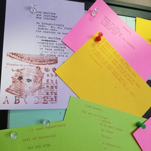 He created the concept for the TypePoetry Project Safety Harbor, and in early September, Derkevics set up a display for the project near the main entrance. This display includes a table and chair, an electric typewriter, index cards to type on and a cork board for typists to hang their finished pieces.