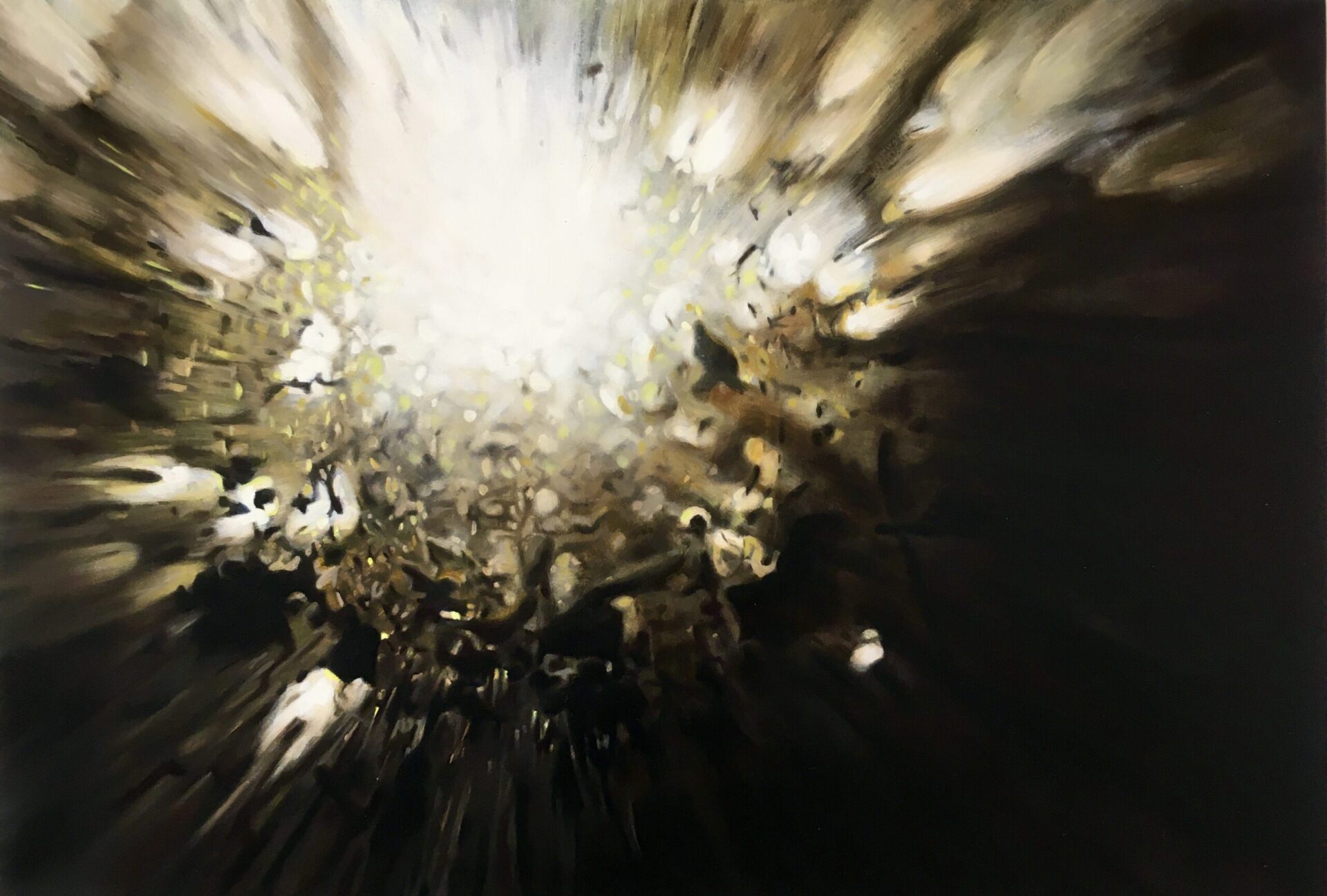 This painting is a translation of a photograph shot through an inadequate lens. It captures a handful of soil and decomposing leaves tossed directly in front of the camera in the forests of my grandparent’s land in rural Gulf Hammock, Fl. The time I spent there with them throughout my formation is a primary factor in making me the kind of person and artist that I am and strive to be. Mama’s lasting legacy I am grateful for, is not the rote ideas she repeated, but her actual connection to life and nature vividly expressed through her tens of thousands of photographs, love and nurturing of plants – especially flowers, humor and infectious smile, enthusiastic piano playing, her quiet and consistent generosity etc…