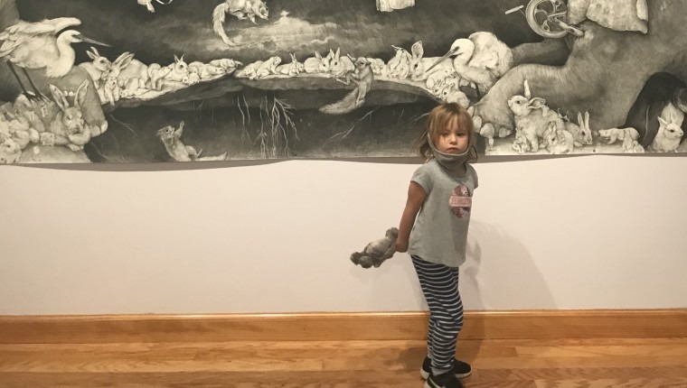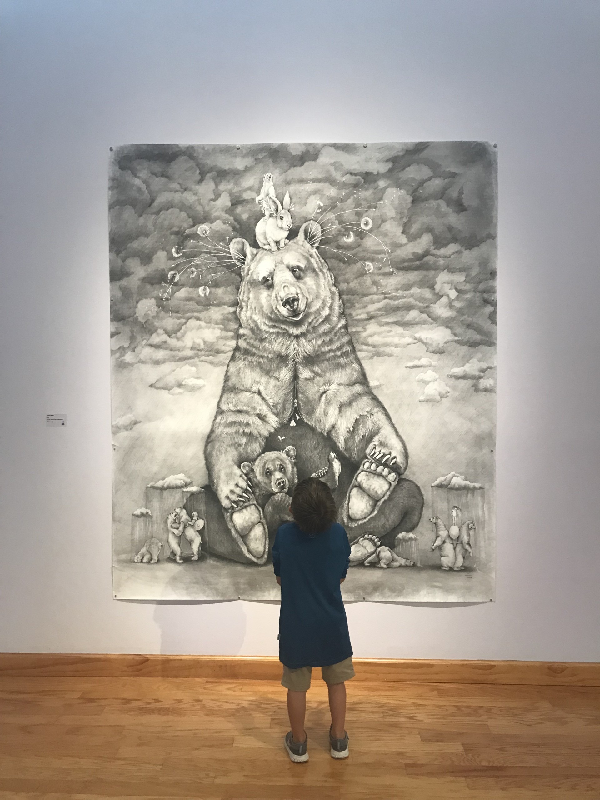 My troupe actually help me “see” art in a different way. They have a knack for unfiltered honesty. It was a cold and overcast day when I took my three kids to the Beasts and Burdens exhibit at the Dunedin Fine Art Center. William, age 6 1/2 (don’t forget the half) looked at one of Adonna Khare‘s large carbon pencil drawings of beasts – predators and prey locked in scenes beyond reality and said “that’s a big piece of paper.” I was so consumed by the layering and mark-making and by the content and technical mastery that I completely forgot to consider the surface material and size.