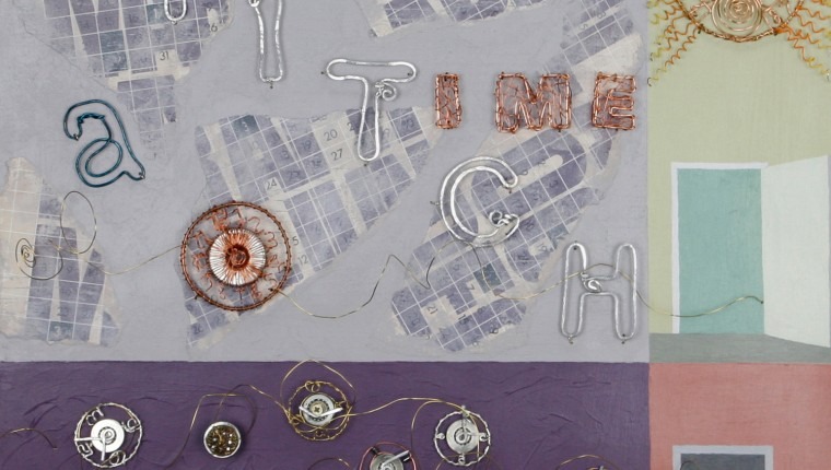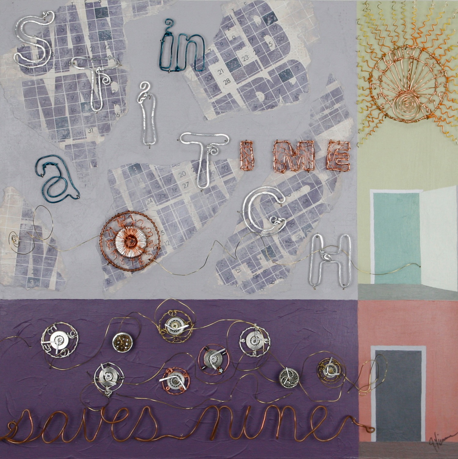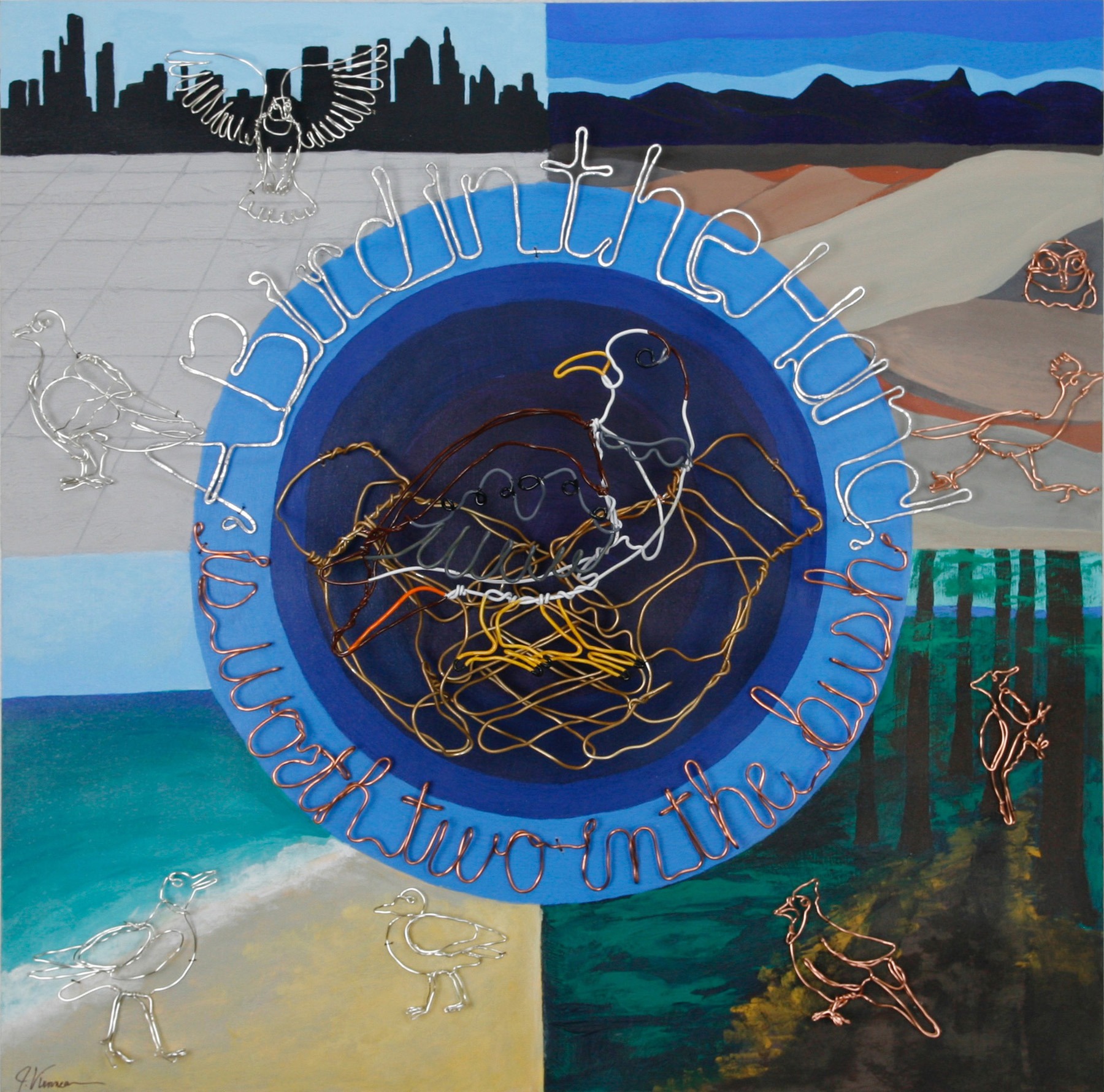 Judy Vienneau’s recent art employs her talent for using various media, paint and a unique technique with wire to “draw in space,” resulting in artwork which falls somewhere between two and three dimensions. She creates paintings with collage on canvas or birch board, upon which wire figures are attached. The intention is for the mixed media background to highlight the story told by the wire figures.