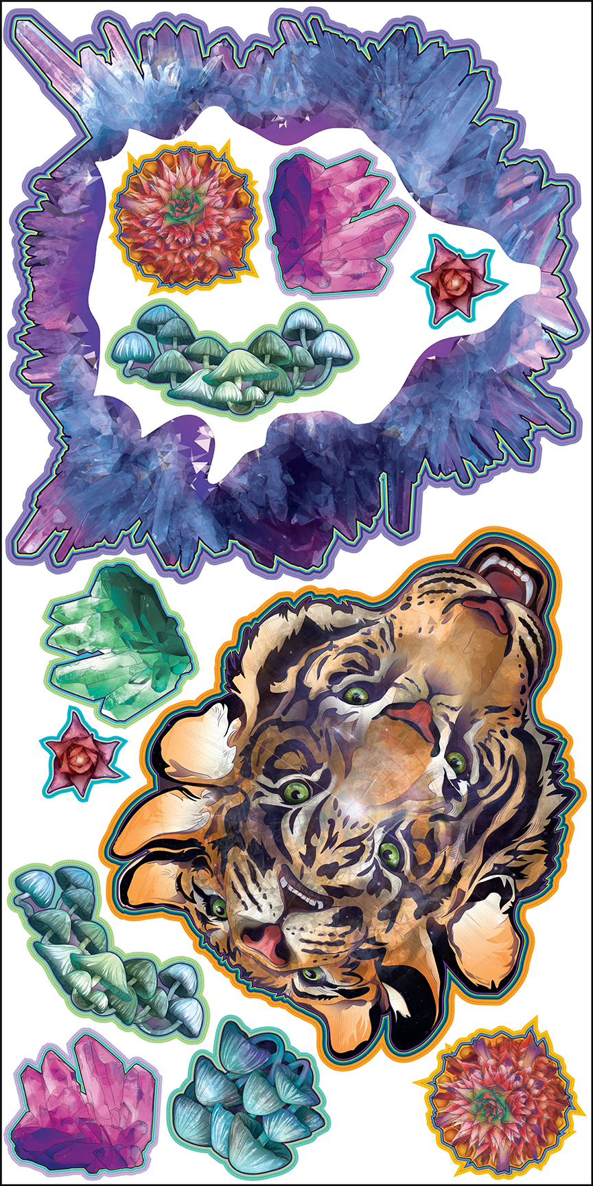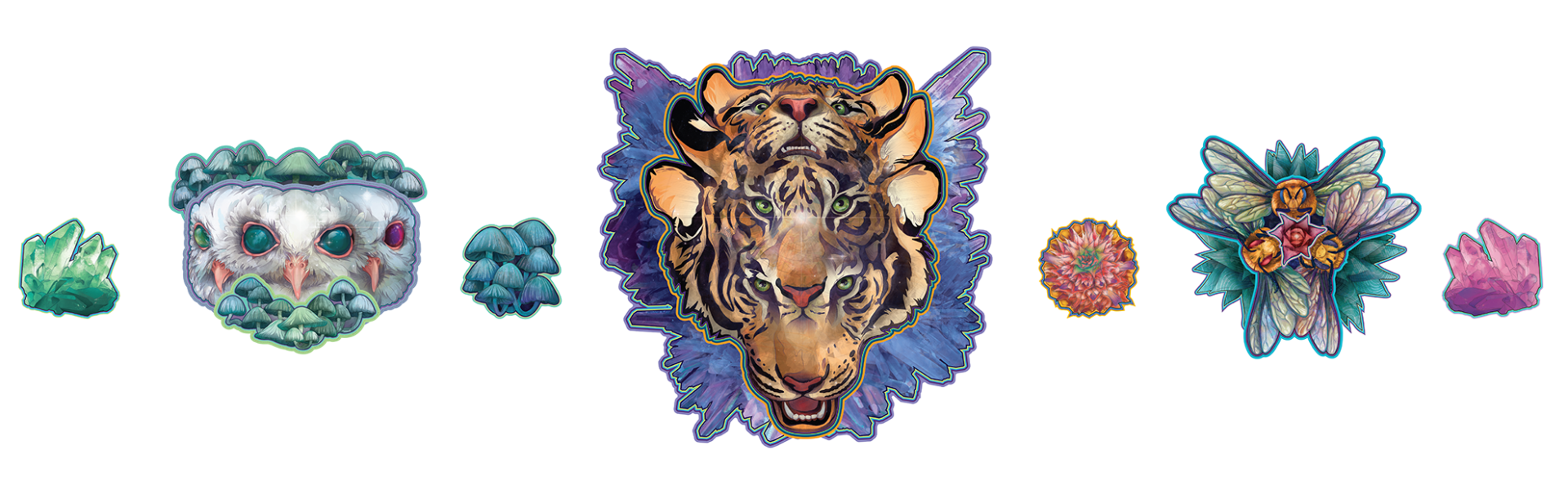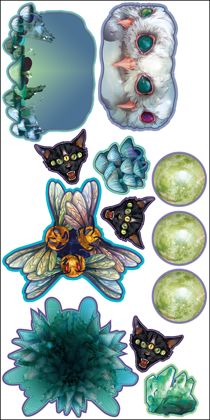 Enough of that nerdy color nonsense! Here’s a look at my final nested 4′ x 8′ sheets – as you can see, I had a bit of spare room and made a few duplicates of the smaller pieces [i.e. the crystal cluster, mushroom cluster, and pineapple top]. I also had enough space to add a few MoonCat Mini prints. If you recall, MoonCat was one of my aesthetic inspirations for this new series of work, so it only seemed natural to print a few more. These MoonCat Minis will be available for purchase on my new website (more on that later).