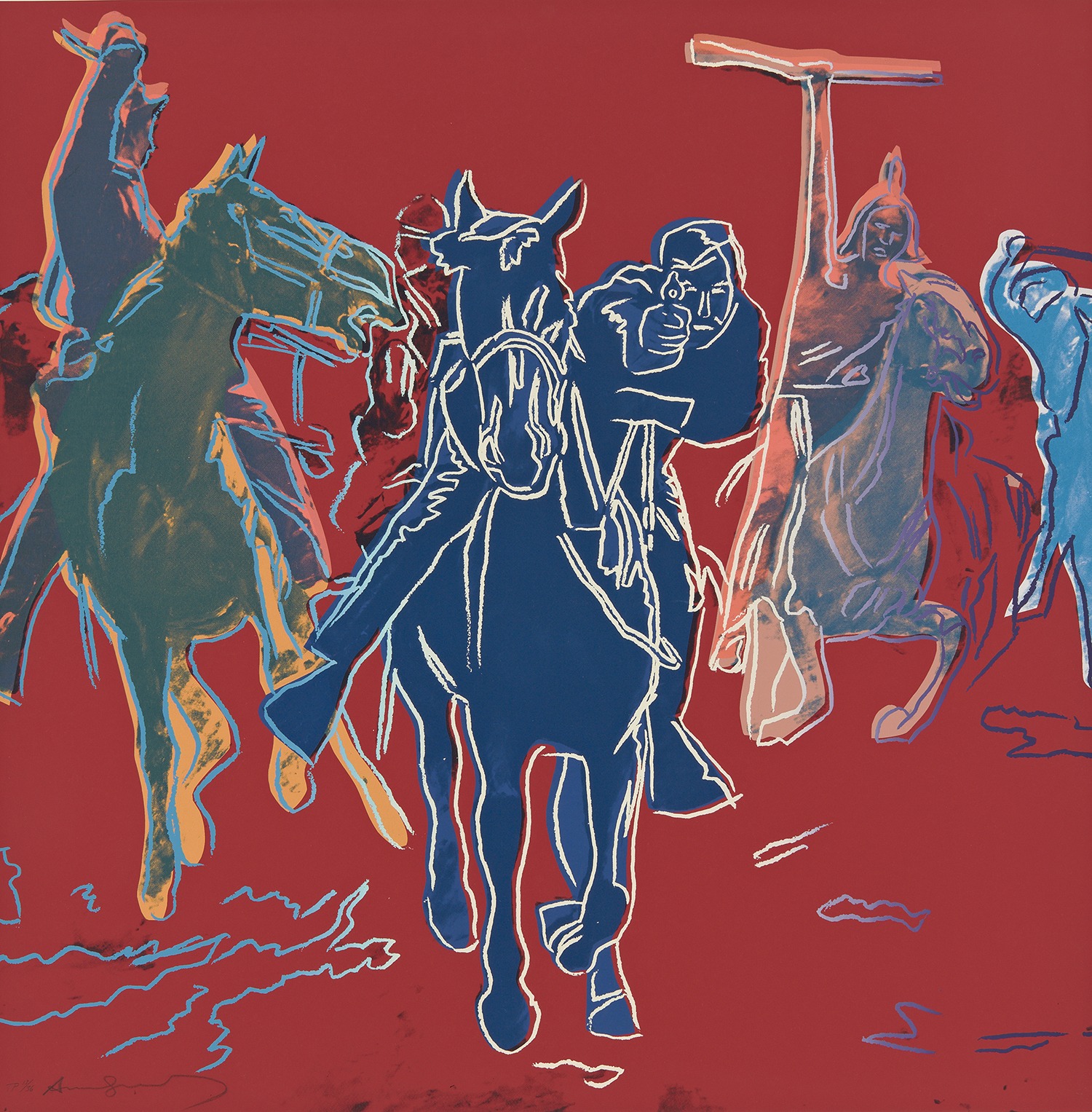 Andy Warhol, Cowboys and Indians: Action Picture, 1986 Screenprint on Lenox, museum board Trial proof 13/36 36 × 36 inches, Booth Western Art Museum, © 2019 The Andy Warhol Foundation for the Visual Arts, Inc. / Licensed by Artists Rights Society (ARS), New York
