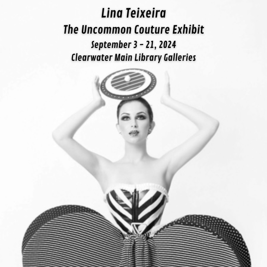 Lina Teixeira, The Uncommon Couture Exhibit Pop-Up Exhibition presents Lina Teixeira’s Wearable Art creations at the Clearwater Main Library Galleries in downtown Clearwater, 100 North Osceola Avenue. The opening reception is Tuesday, September 3 from 6 to 8 pm. A Jazz Duo from the Clearwater Jazz Holiday program, Give Them a Stage, will perform live music during the reception.