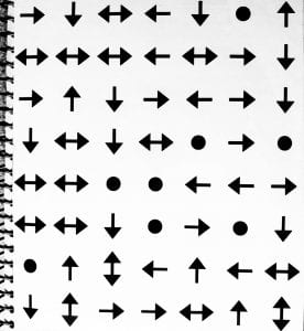 In this symbol chart from my choreography journal, I used the arrows to determine the direction of spatial pull on the body and the dots to represent either stillness or turning.