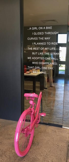 A couple of years later Katee and I collaborated again for The Pink Event: The Pink Beneath Our Feet, a fundraiser for the SunLit Festival. In this collaboration–hosted at the office of Behar+Peteranecz Architecture, whose fabulous digs added its own vibe — Katee’s artwork played off lines of my poems selected from my book, Pink Streets.