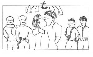 The script required a complicated night shoot for the homage I had in mind. In the scene, a secular Jewish lesbian has just left dinner with an Orthodox woman for whom she’s developing romantic feelings. She drives past a lesbian bar and observes a couple mashing on each other as they come out of the bar.