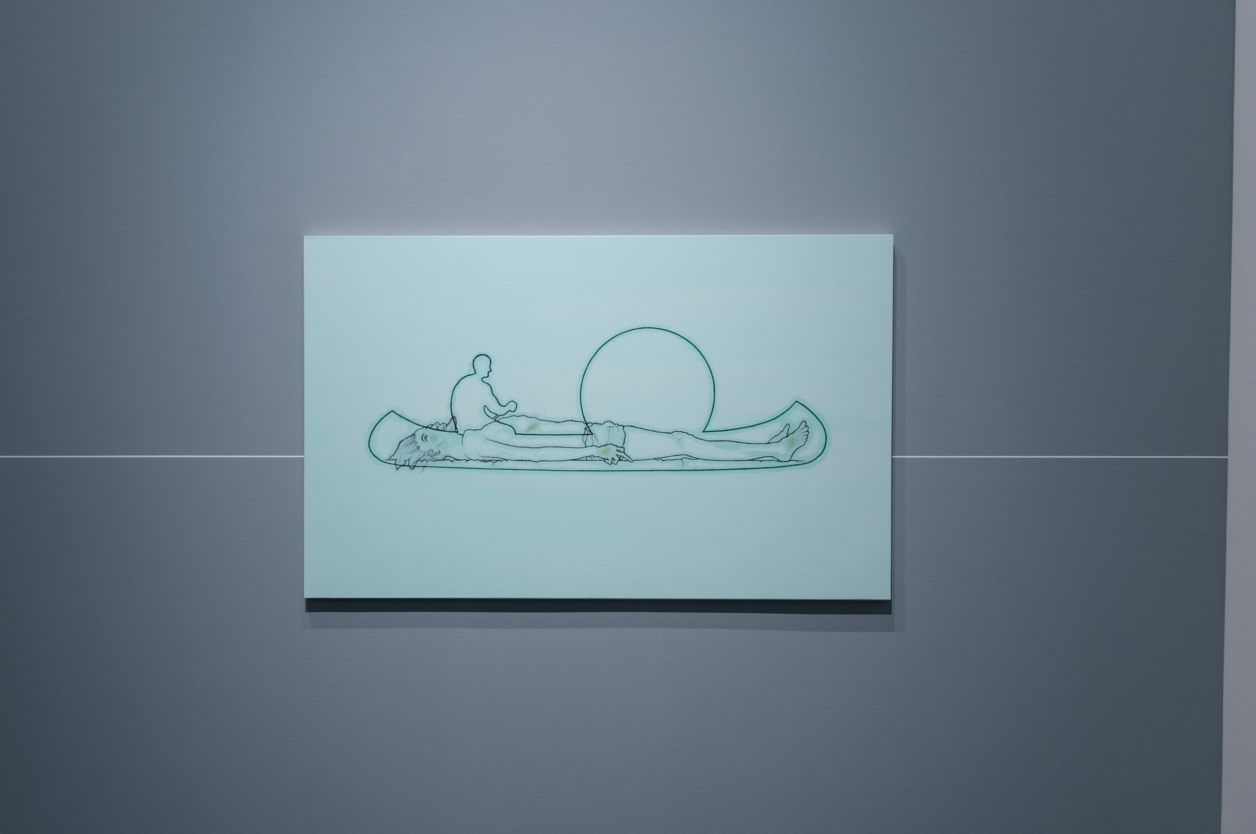 What we see in Canosa’s painting is the body of Christ in the bottom of a canoe being paddled either under a full Moon or a setting Sun. Perhaps the paddler is Charon delivering the body to Hades, or Canosa simply likes the horizontality of both the body and the canoe. In any event, there is a merging of art history with the contemporary which is a clear theme in Canosa’s work.