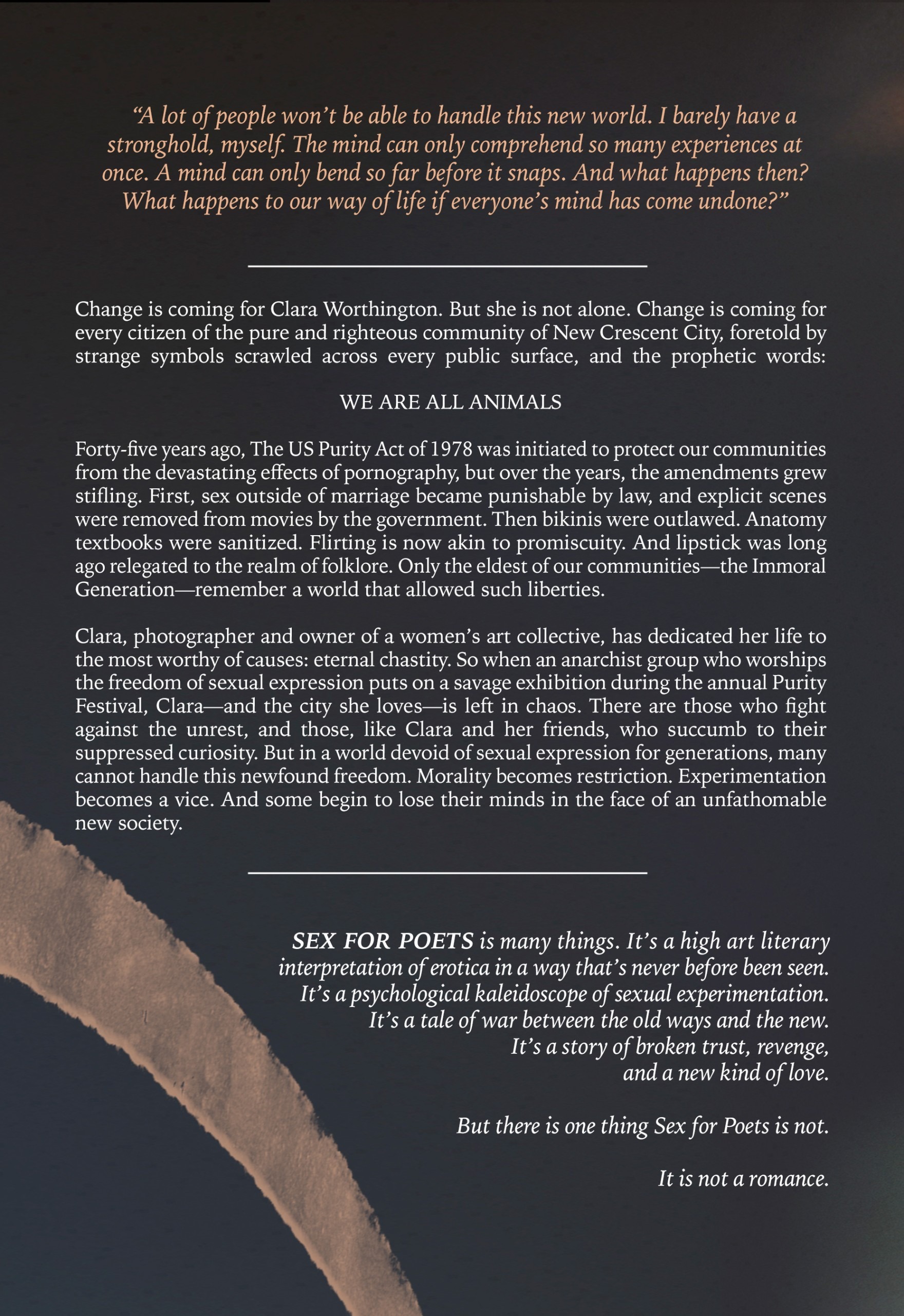 Sex for Poets is still a work-in-progress, but is slated for release in the Fall of ’23. In a very short amount of time, I will begin posting read-aloud chapter by chapter reveals (the rough draft) on a Youtube channel titled: “Late Night Date Night Storytime” (or something like that). And then it will be out there in the public for all to see and hear.