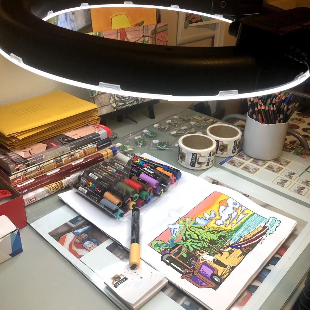 For the most part I absolutely love that my studio is in my home. I have two large windows that bring in natural light all day long and the sounds of a water fountain. It’s pretty soothing and I’m extremely blessed to have such a space. Over the years I’ve worked up to having everything I could need in here to create my work. I have a drawing desk, work station, easels, brush and paint shelves, the works. As Sketzii grew as a creative entity I knew I needed a dedicated work space for not only creating art but shipping art and products too.
