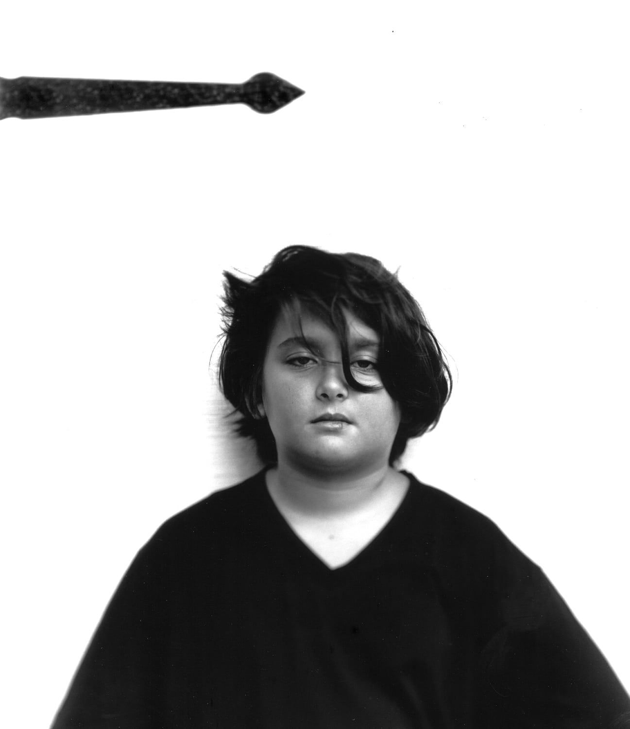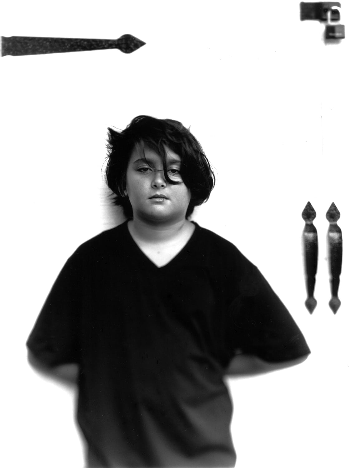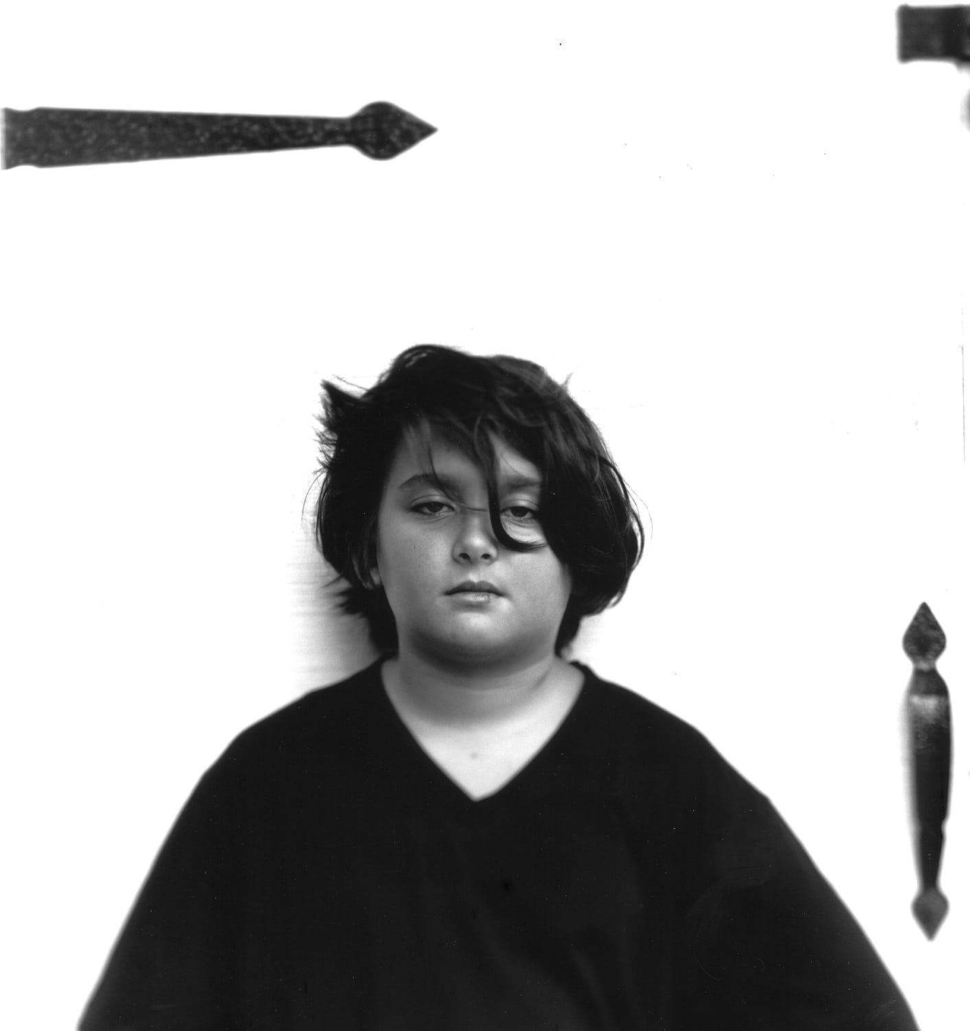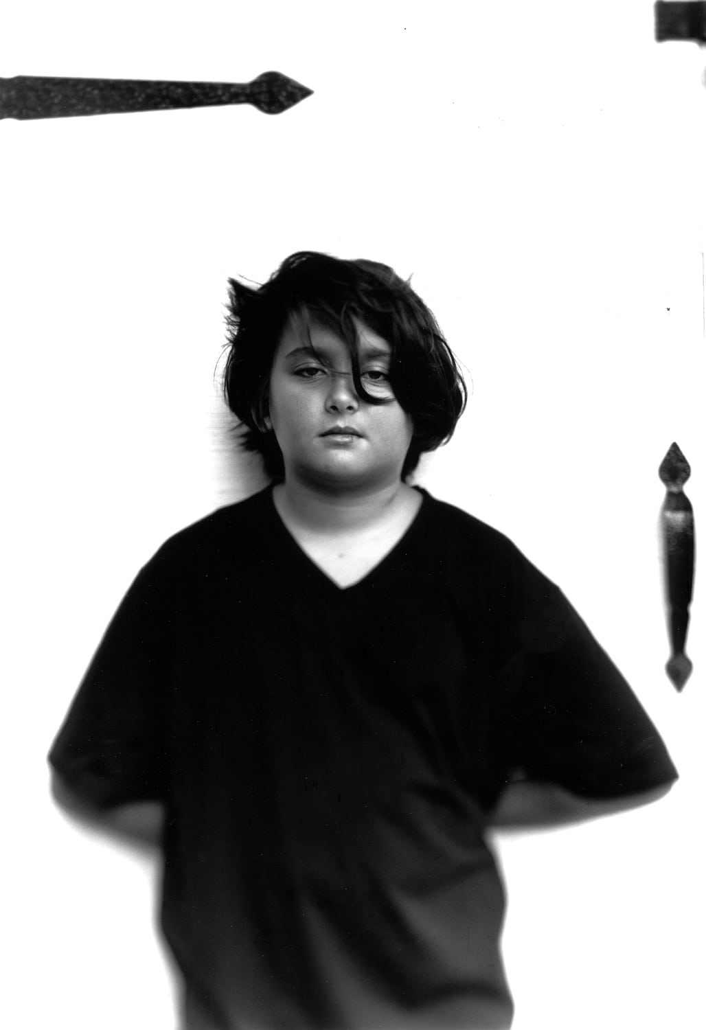 In the heat, Lilli, 11, was impatient, hot and miserable. I went there to try something new, and she was going to model. That was that. I grabbed a large black T-shirt from a pile of clean laundry on a sofa in my daughter’s living room. I stood Lilli in front of this white shed on the side of the house, which was shaded from the afternoon sun. I couldn’t compose the black hardware on the shed around her face in a pleasing way. And she wasn’t getting any happier. But this is the advantage of the large 4″ by 5″ negative: there is plenty of negative to crop and still have enough image to enlarge. I tried cropping several ways with my L-shaped mats in the darkroom and thought I would include them here.