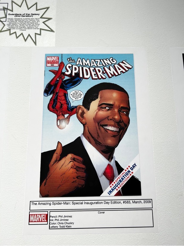As the exhibit developed we got to see more recent work like The Walking Dead, a hit TV show and comic, and more obscure comics and crossovers like Spider-Man at Barack Obama’s Inauguration Day.