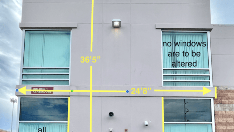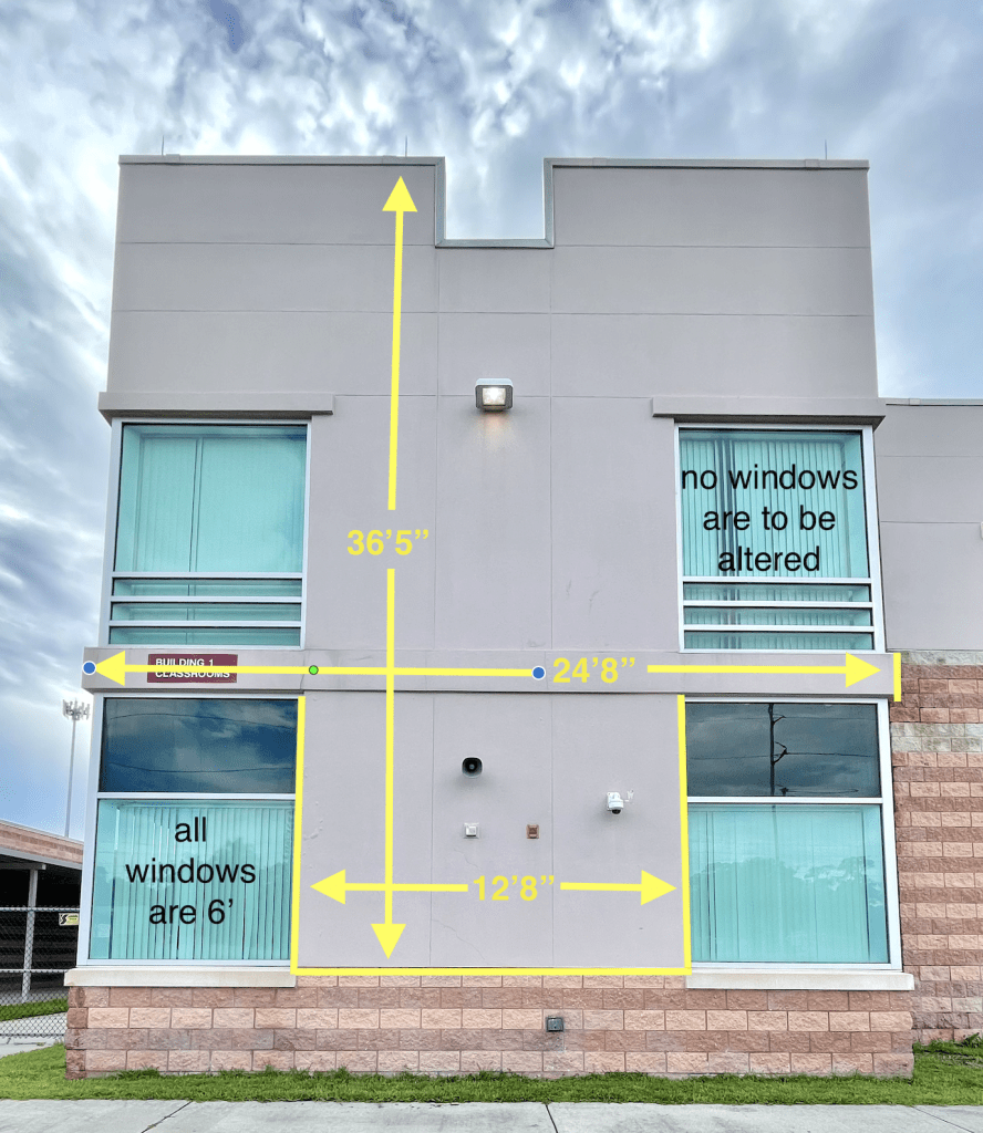 This wall is facing north. The windows are not to be altered in anyway. The bricks towards the bottom are to be covered so no paint gets on them. The bricks are not to be included in the painting process.