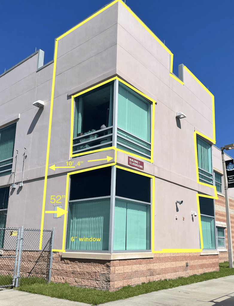 The yellow line on the left is where a seam in the building is. You will be painting starting from that seam wrapping around to the front of the building